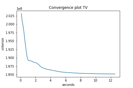 figure; plot(time, crit); title('Convergence plot'); xlabel('seconds'); ylabel('criterion')