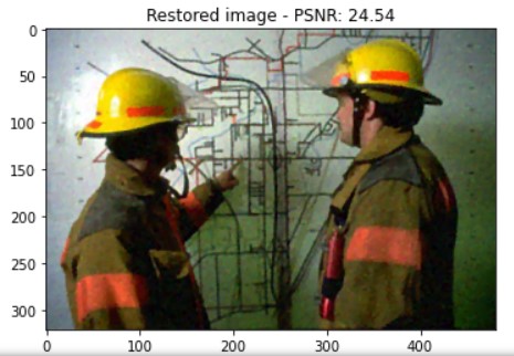 figure; imshow(x/255,[]); title(['Restored image - PSNR: ' num2str(round(psnr,2))])